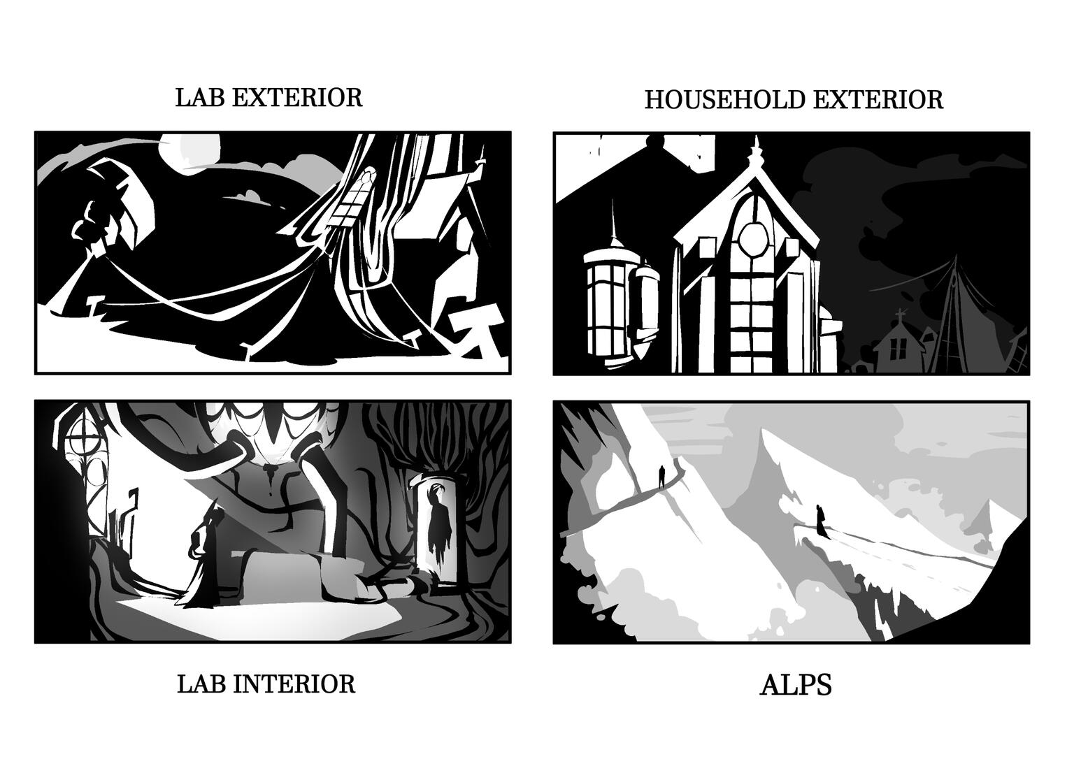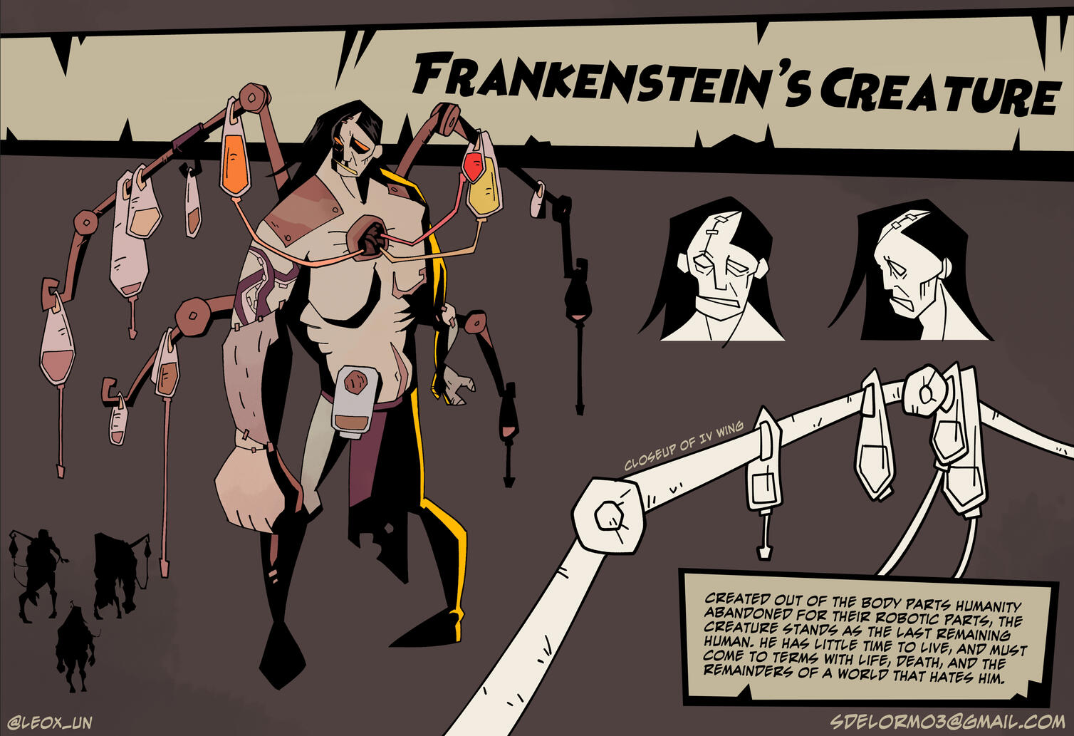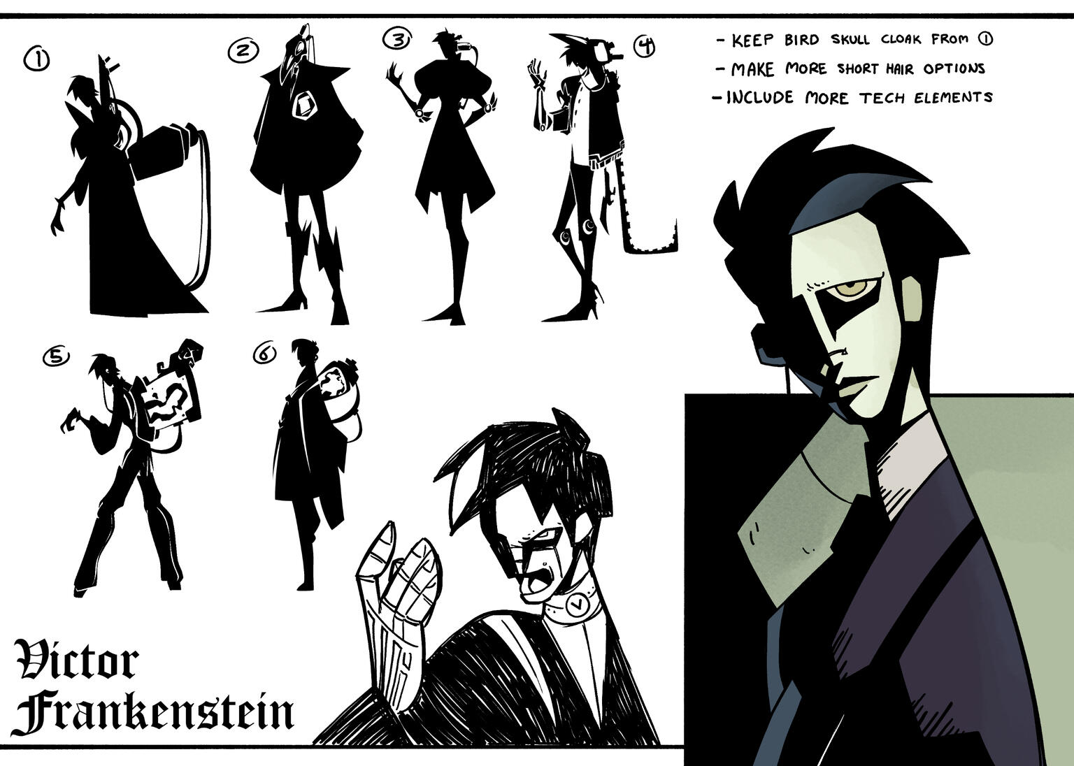 Visual development work on a biopunk Frankenstein story set in a style inspired by Mike Mignola.